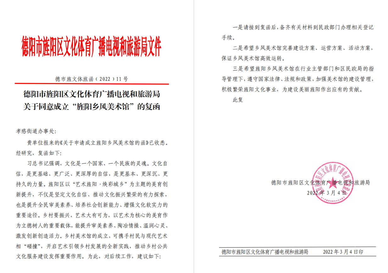 成果转化: 今年1月,孝感街道乡村振兴办在红伏村“红光印象”研学小镇划拨了4间专用房,用于“旌阳乡风美术馆”建设项目。项目建设办根据项目建设要求,加强了美术馆用房管理; 1月上旬,孝感街道上报成立“旌阳乡风美术馆”公函, 3月4日,区文体旅局下发了同意成立“旌阳乡风美术馆”的复函; 2-3月孝感街道先后五次携成都市珈蓝设计有限公司,对接德阳市文化馆刘代明馆长,对美术馆建设设计方案修订征询意见,设计方案的敲定为下一步顺利进场施工,保障建设质量、按期交付使用奠定基础。