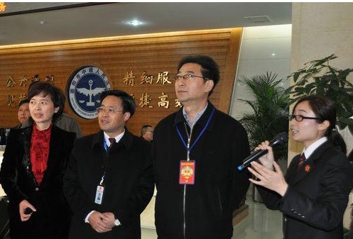 视察组一行实地察看了诉讼服务中心软硬件设施配备情况,详细了解了13个服务窗口提供的“一站式”服务功能。