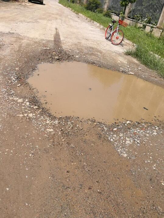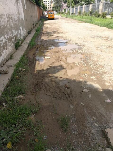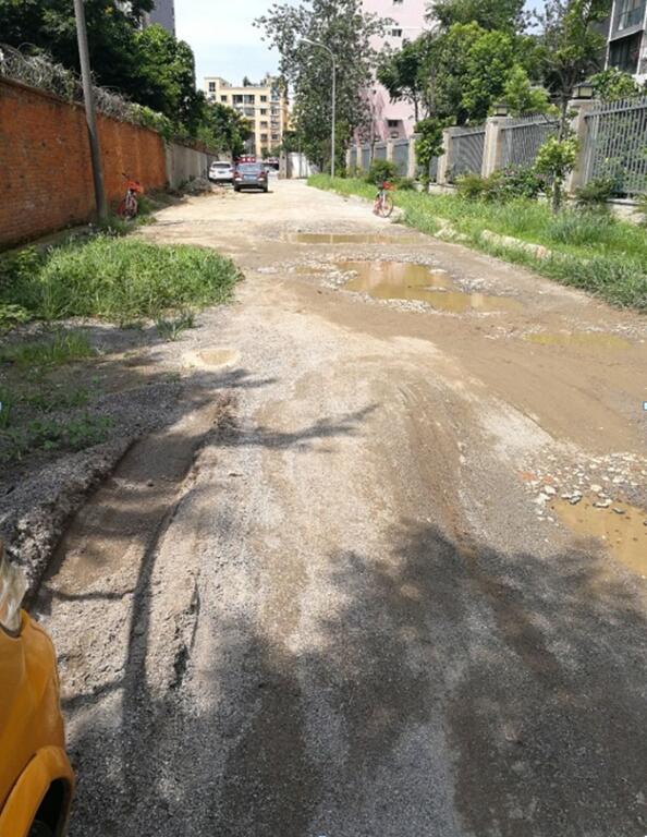 该道路是屏山街景秀花苑等几个生活小区通往玉泉菜市的必经之路。道路长约150米,西头连接庐山北路,东头连接屏山街。该道路是典型的城市“断头路”。在连接屏山街一头,有约50米是没有硬化的泥土路面,路上堆放着一些沙石,路面坑洼不平,晴天泥沙飞扬、雨天到处积水(如图),周围群众出行只能绕道而行。