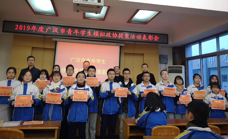 11月21日下午,在广汉中学召开了“2019年度广汉市青年学生模拟政协提案活动表彰会”,对114名参与模拟提案活动的优秀学生,4名优秀指导老师进行表彰。表彰会上,广汉市政协提案委负责人对青年学生关注社会热点、热心广汉建设、助力家乡发展的主人翁精神给予肯定和赞赏。广汉中学负责人寄语同学们正确处理好“小我”和“大我”的关系,将个人成长融入国家发展、民族复兴大业,做有理想、有本领、有担当的新时代青年。