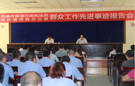 5月21日,市外侨办、市城管执法局联合召开群众工作先进事迹报告会。会议邀请四川省群众工作先进典型——绵竹市群众工作接待中心主任何文礼同志作先进事迹报告。