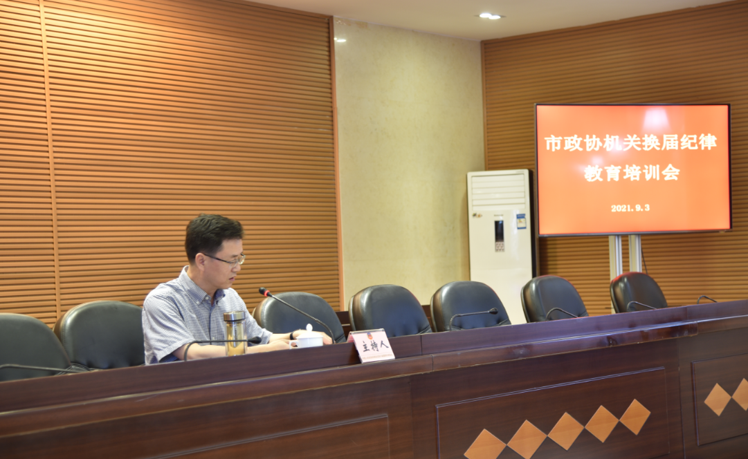 9月3日,市政协机关召开严肃换届纪律专题培训会,市政协党组副书记、副主席陈若愚,副主席汪国华、徐春龙、尹艳、罗春华、靳钊军,市一级巡视员吴玉华出席会议。秘书长刘述明主持会议。