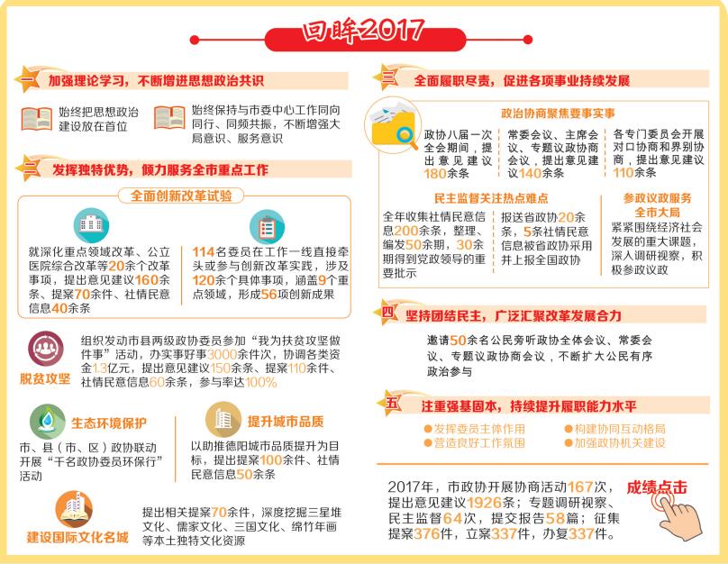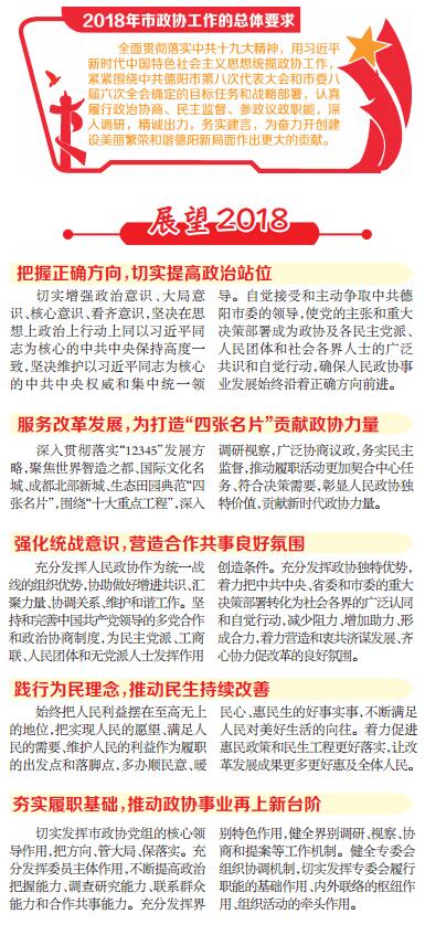 一年来,市政协在中共德阳市委的正确领导和省政协的指导支持下,高举中国特色社会主义伟大旗帜,准确把握人民政协性质定位,坚持市委中心工作推进到哪里,政协履职就跟进到哪里,认真履行政治协商、民主监督、参政议政职能,开创了政协工作新局面。2018年,市政协将认真履行政治协商、民主监督、参政议政职能,深入调研,精诚出力,务实建言,为奋力开创建设美丽繁荣和谐德阳新局面作出更大的贡献。