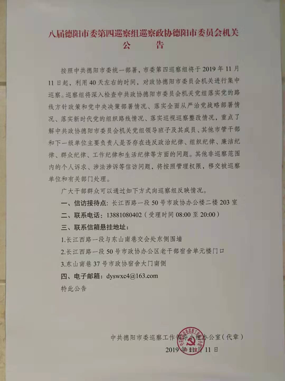 八届德阳市委第四巡察组巡察政协德阳市委员会机关公告