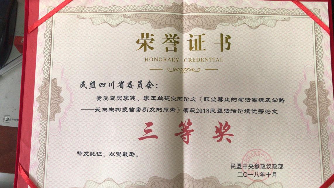德阳民盟市区支部主委李健和盟员李玉兰凭借长期以来对理论的研究和丰富经验,以职业禁止规定在司法实践适用中的困境为立足点,结合今年长生生物疫苗案这一社会热点,在共同撰写的《职业禁止的司法困境及出路—长生生物疫苗案引发的思考》一文中,提出解决职业禁止适用困境的措施。经专家评审,该论文获得本次论坛征文三等奖,被载入《民盟法治论坛论文集》。